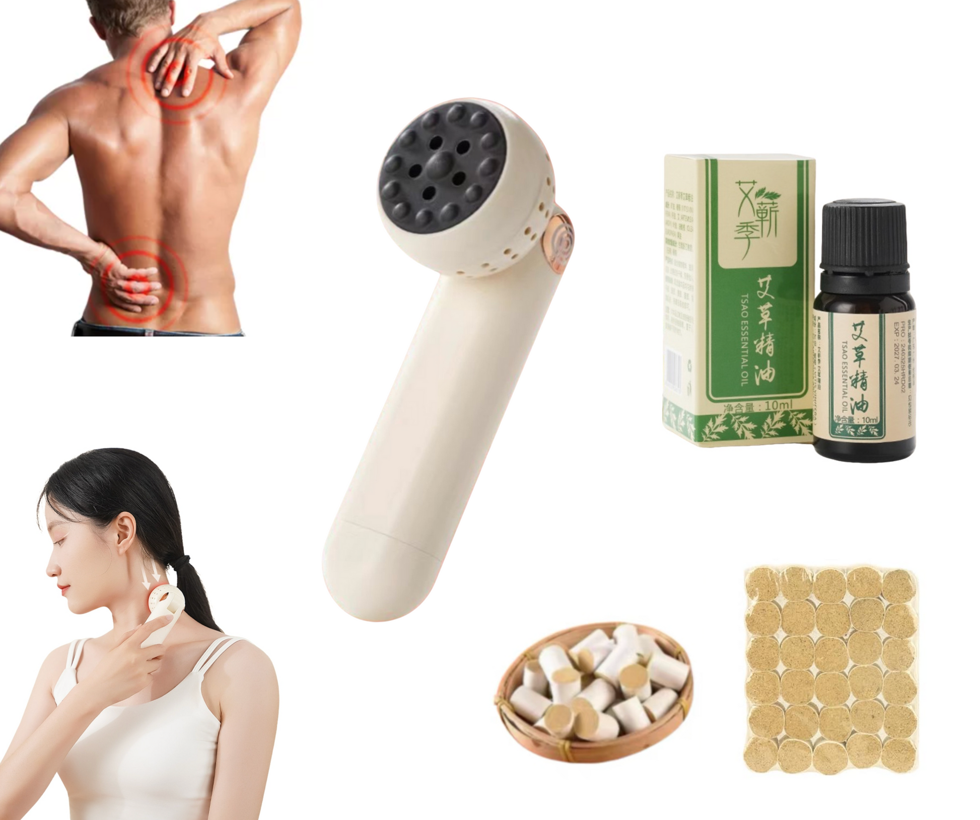 Gua Sha de moxibustión con piedra natural Bian, varillas de moxa y aceite esencial